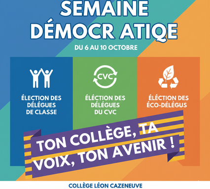 Par Admin Léon Cazeneuve, publié le lundi 6 octobre 2025 17:07 - Mis à jour le lundi 6 octobre 2025 17:11Élection des délégués de classe - Élection des membres du CVC (Conseil de la Vie Collégienne) - Élection des éco-délégués -